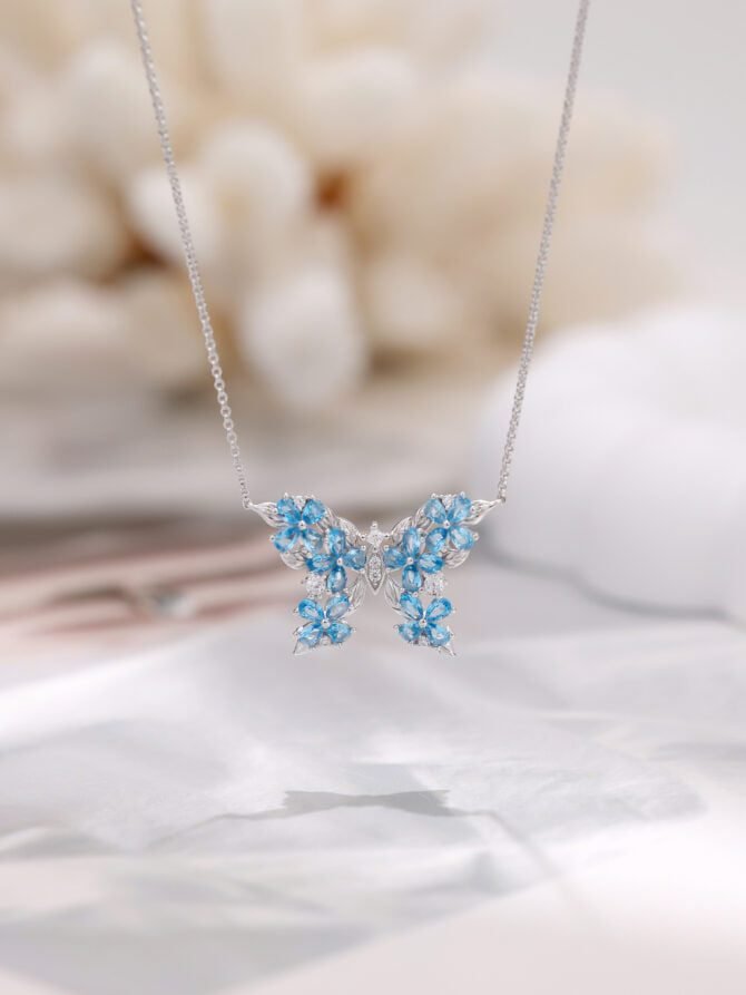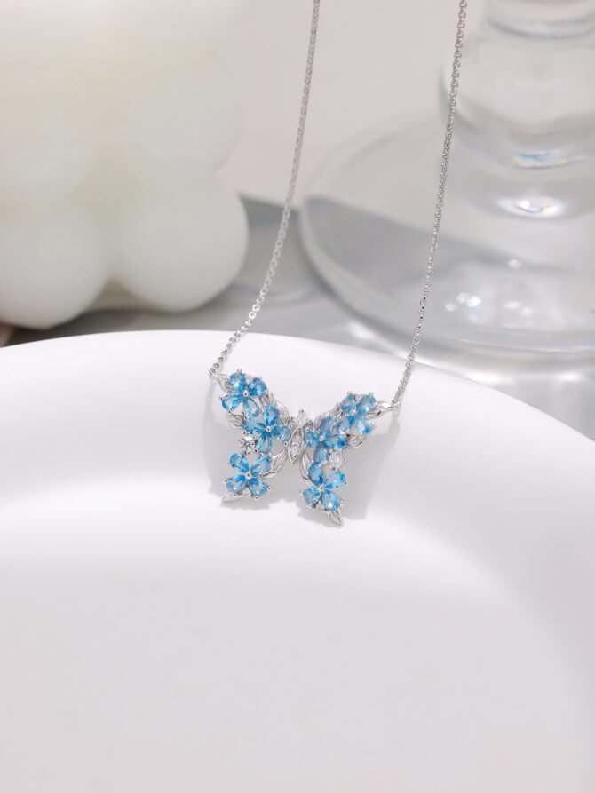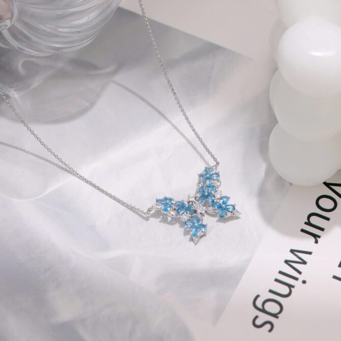 The butterfly pendant is made from high-quality 925 silver, ensuring durability and long-lasting beauty. The intricate design of the butterfly showcases its delicate wings, which are studded with sparkling zirconia and blue crystals. The combination of the silver, zirconia, and blue crystals creates a mesmerizing effect that catches the light from every angle.