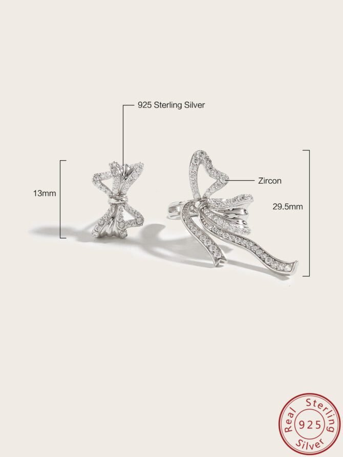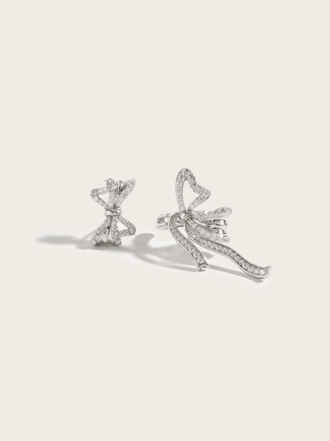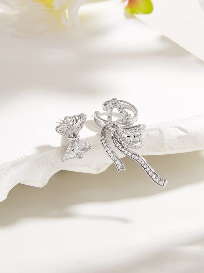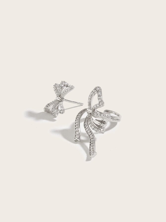 925 Silver Diamond Butterfly Bow Asymmetrical Earrings Set