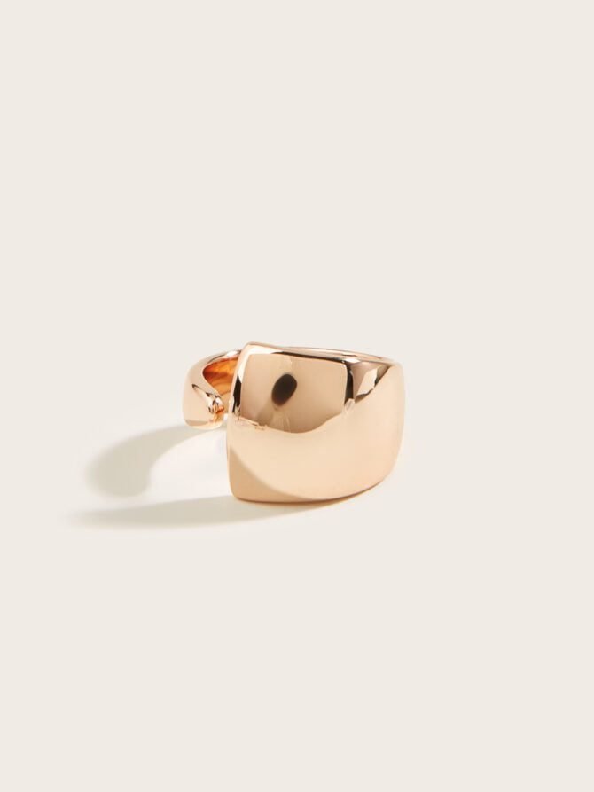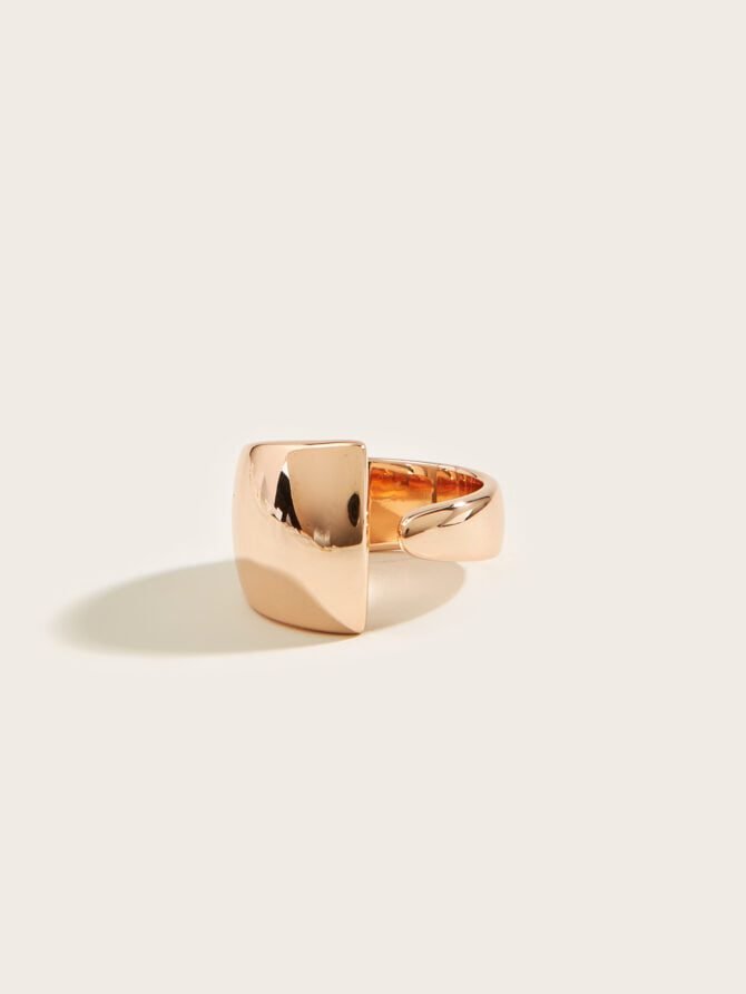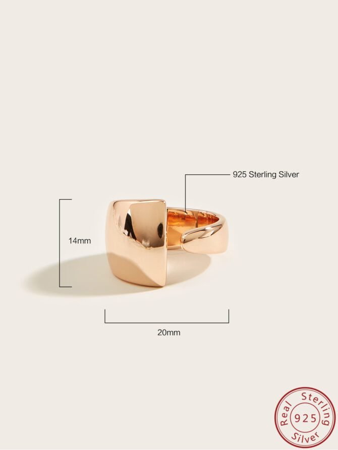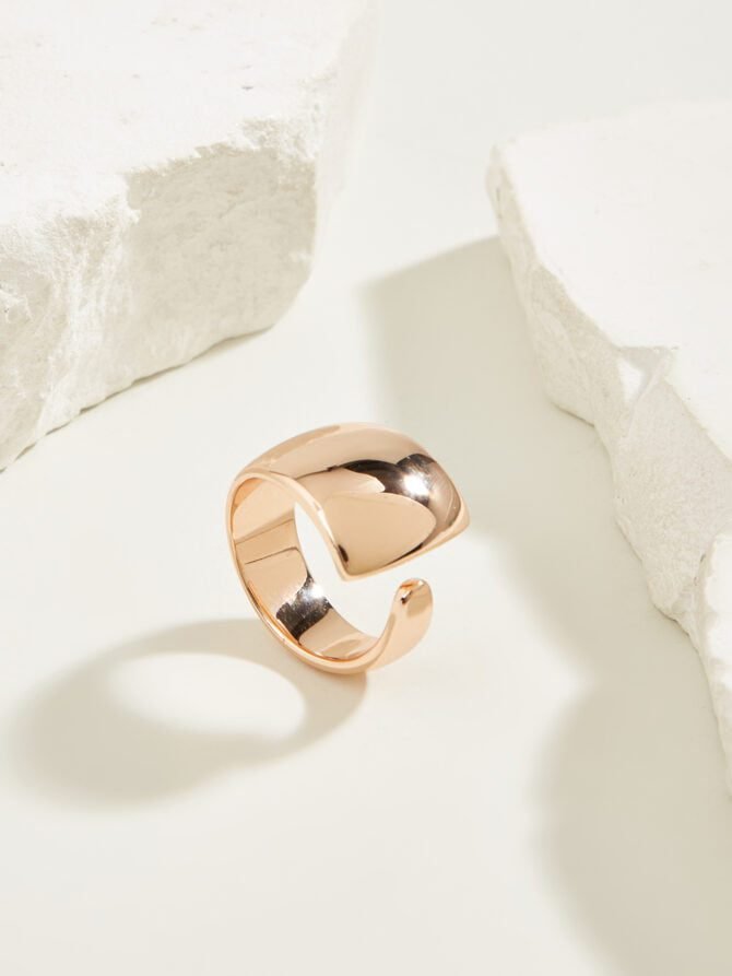 Crafted in luxurious rose gold, this adjustable ring features a unique design with a wide top and a narrow bottom. It is a solid piece that exudes elegance and sophistication, making it the perfect accessory for important occasions. The sleek and minimalistic design of this ring adds a touch of class to any ensemble, making it a versatile and timeless piece for your collection.
