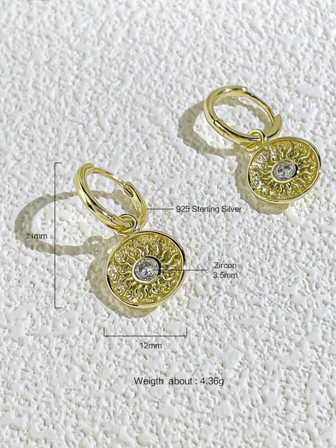 These earrings are made with 925 silver, a high-quality material that ensures durability and a brilliant shine. The round shape of the earrings adds a classic touch, while the intricate sun design brings a modern twist. The combination of silver and diamonds creates a captivating contrast that catches the light from every angle.